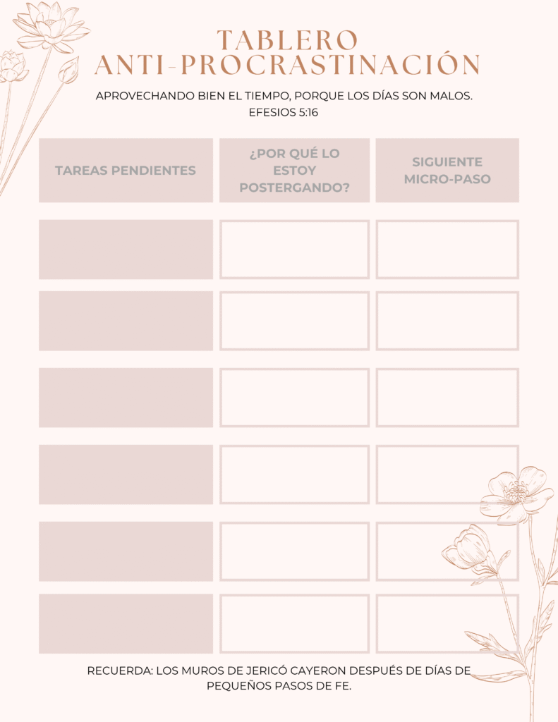 Descárgalo, imprímelo o úsalo en tu tablet. Te ayudará a organizar lo que postergas, convertirlo en pequeños pasos y mantenerte enfocada cada día.